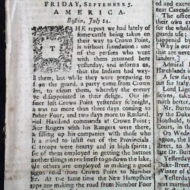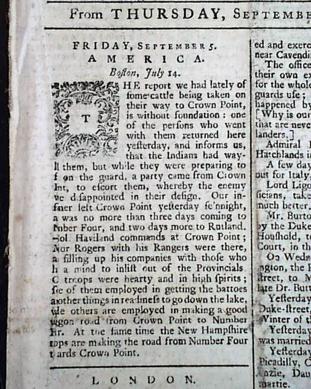 The front page begins with an article headed: "America" with a Boston dateline. It includes: "...report we had lately of some cattle being taken on their way to Crown Point is without foundation...the Indians had waylaid them, but while they were preparing to fall on the guard, a party came from Crown Point...whereby the enemy were disappointed in their design...Co Haviland commands at Crown Point; Major Rogers with his Rangers were there..." and more, taking half of the first column.