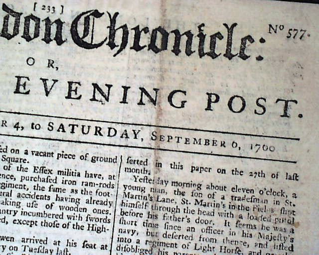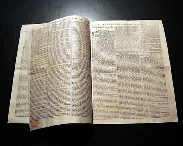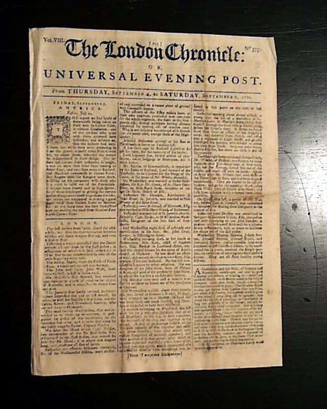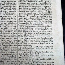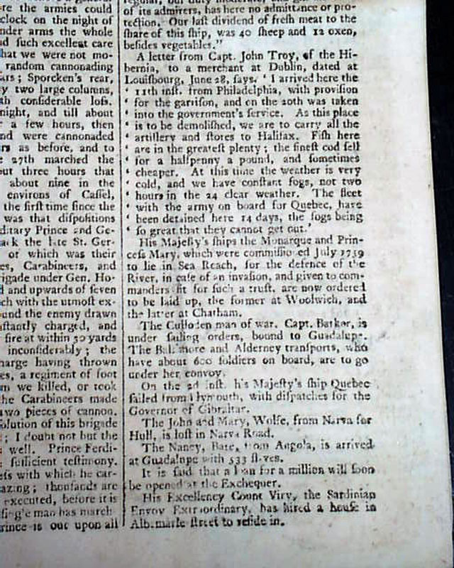 Page 5 has a report Louisburg, Nova Scotia, noting: "...arrived here...from Philadelphia, with provision for the garrison & on the 20th was taken into the government's service. As this place is to be demolished, we are to carry all the artillery & stores to Halifax...The fleet with the army on board for Quebec has been detained here 14 days...". Eight pages, 8 bay 11 inches, rubbing to front page folds, nice condition.
