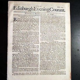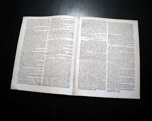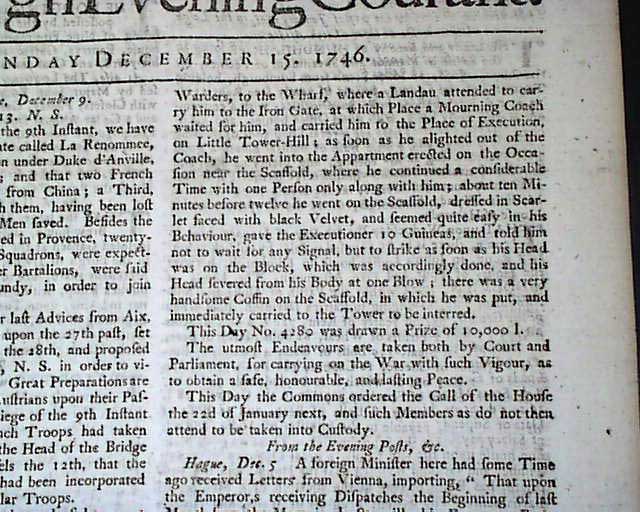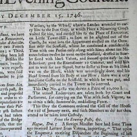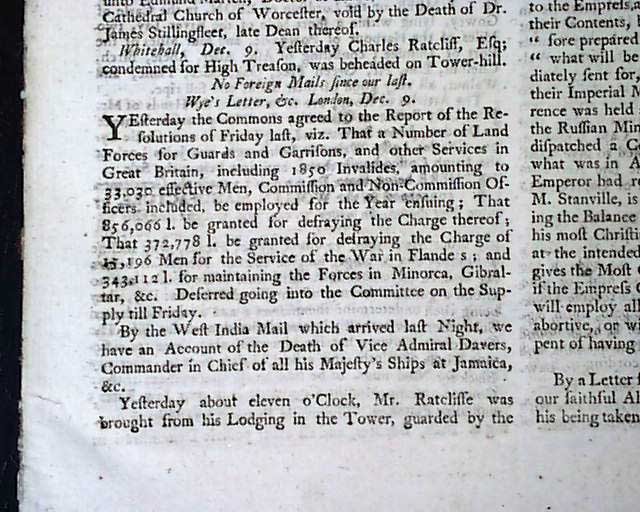 The front page has a brief item: "Yesterday Charles Ratcliff, Esq., condemned for High Treason, was beheaded on Tower-Hill." And a bit further on is more detail concerning his execution, noting in part: "...about eleven o'clock, Mr. Ratcliffe was brought from his lodging in the Tower...to the wharf...carry him to the Iron Gate at which place a mourning coach waited for him & carried him to the place of execution...he went on the scaffold...gave the executioner 10 guineas & told him not to wait for any signal, but to strike as soon as his head was on the block, which was accordingly done, and his head severed from his body at one blow..."